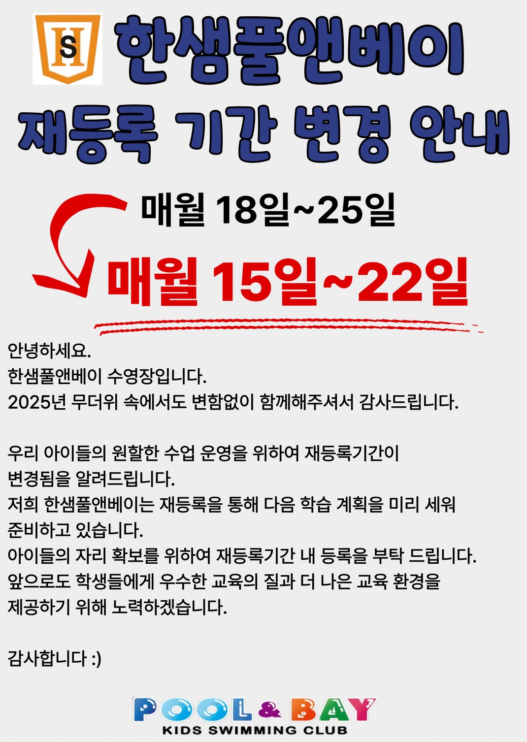 재등록 기간 변경 안내 작성자관리자 등록일 25-09-17 조회40회 본문 안녕하세요~ 한샘풀앤베이 수영장 화성시청점 입니다 10월부터 재등록 기간이 변경되어 안내 드립니다. 다음달부터 변경된 재등록 기간으로 진행 하오니 스케줄 참고 해주세요~^^ 10월 수업일정 안내 2025년 안산 시장배 전국 마스터즈 수영대회 목록